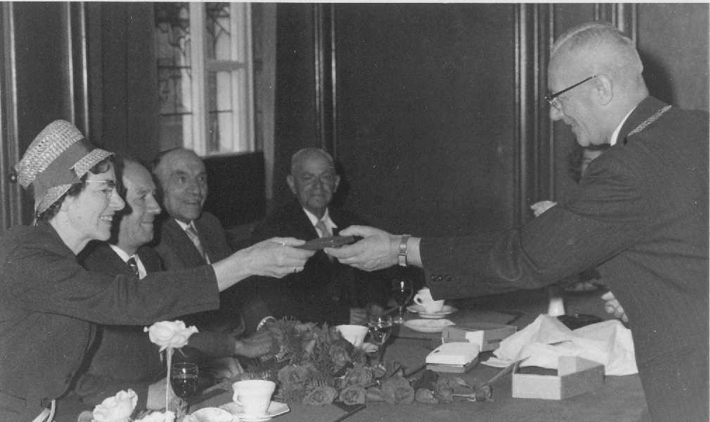 Burgemeester Feitsma en mevrouw Van Wijngaarden bij onderscheiding van haar man