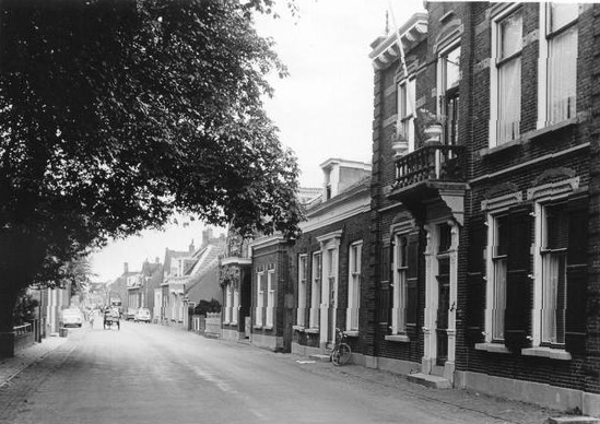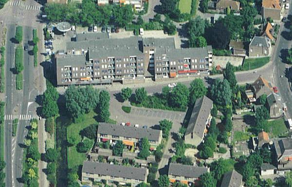 Omgeving van de vroegere zaak van Gort Electro in wijk B. Rechts met balkon vroegere woonhuis dokter Bikker.