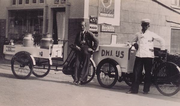 Melkboer Goedhart en DMI-ijsverkoper voor de de winkel van Teun de Bruin in wijk C