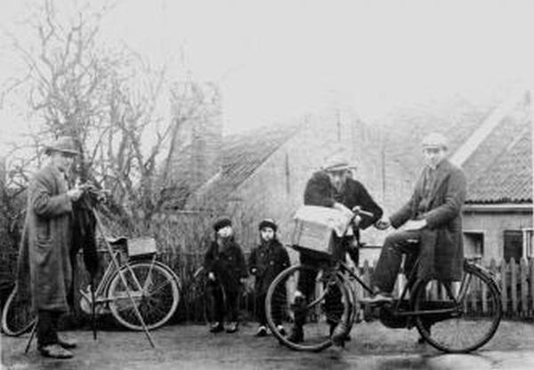 Hello, een Papendrechts fotograaf zet Sliedrechtenaren op de kiek. Fotokaart bij Jordaanstoep 1935 Links fotograaf Otto Hello uit Papendrecht R. J.C. van Genderen en Joost Hoekwater bij transportfiets. Kind Jaantje Klein