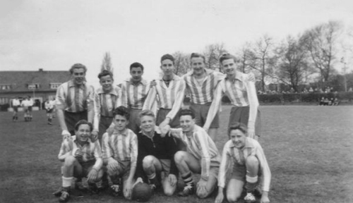 Voetbalelftal Openbare ULO-school tijdens het schoolvoetbal op het Hobbemaveldje