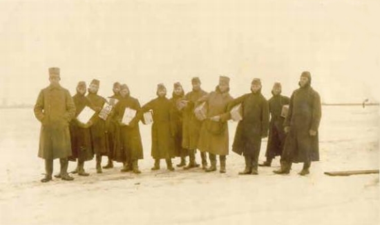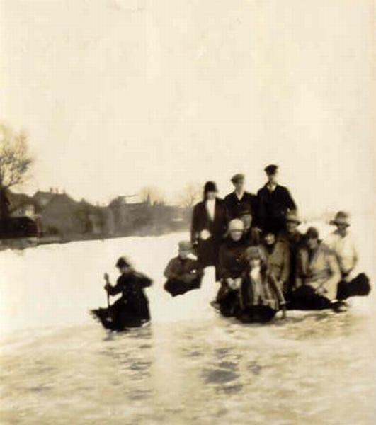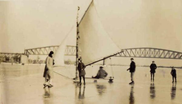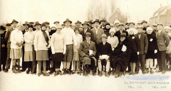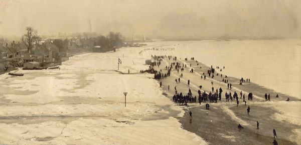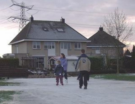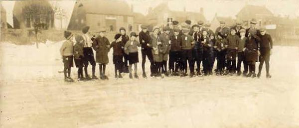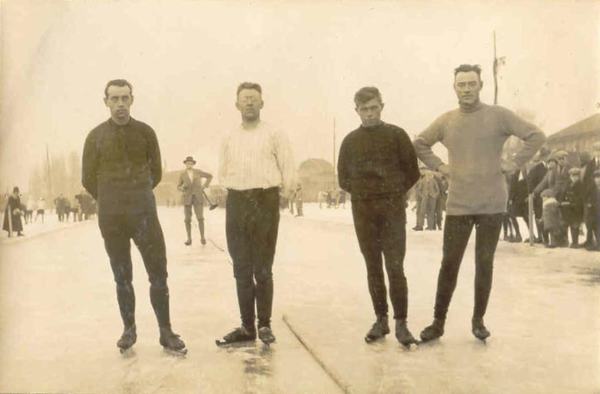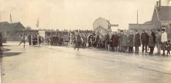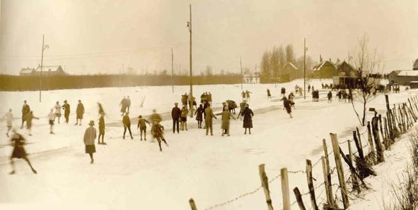 Hardrijders op de schaat op een ijsbaan aangelegd op de rivier