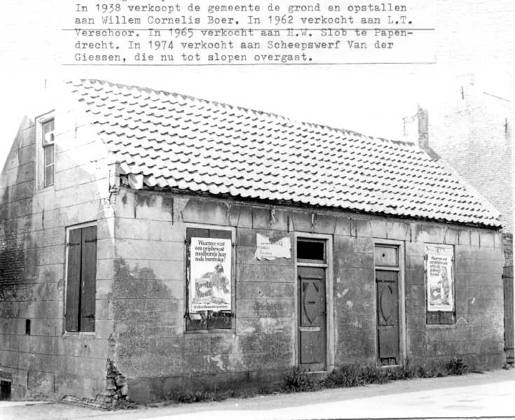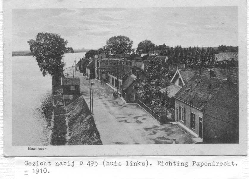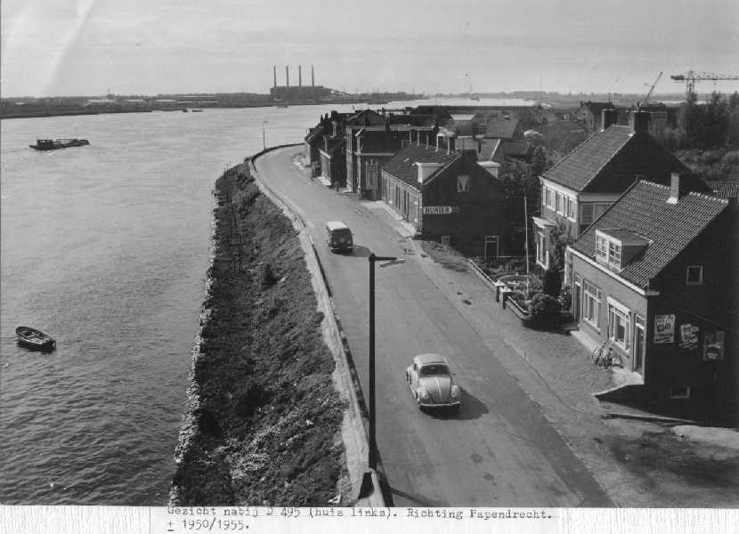 Gezicht vanaf spoorbrug richting Papendrecht, nabij D 495.Het huis met het afdak was van Rijkswaterstaat Het huis is verwoest toen in de oorlog de spoorbrug werd opgeblazen. Na de oorlog is op de fundering een nieuw huis gebouwd