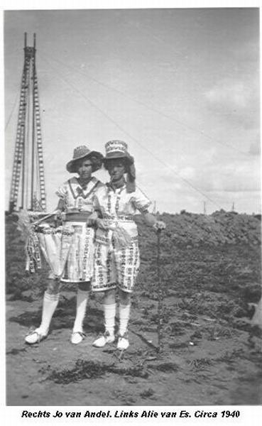 Jo van Andel en Alie van Es circa 1940 in pakjes gemaakt van kranten klaar voor een optocht.