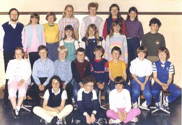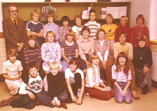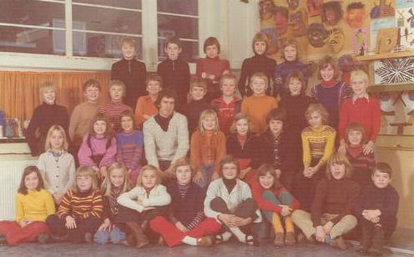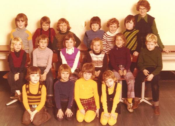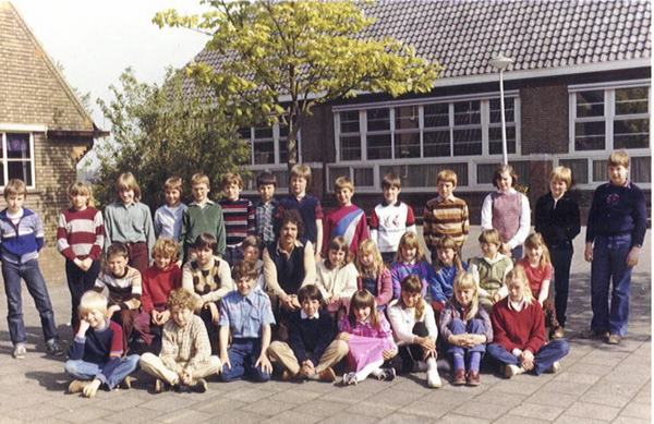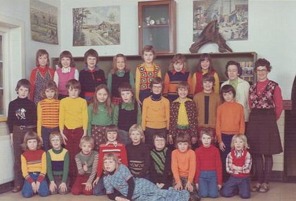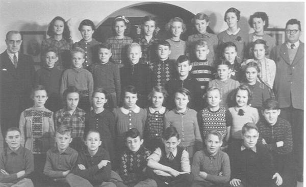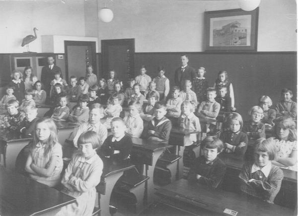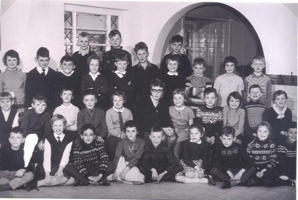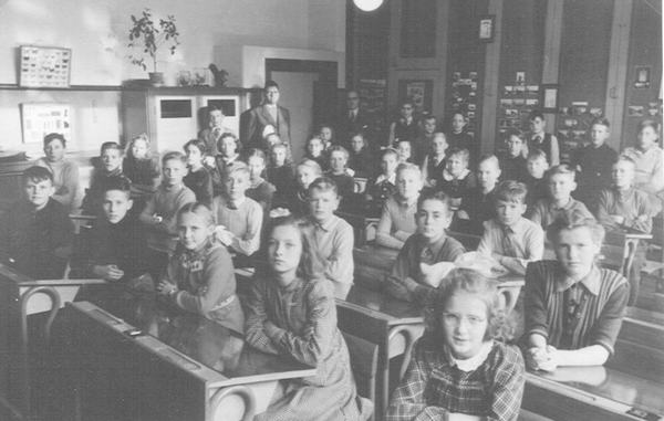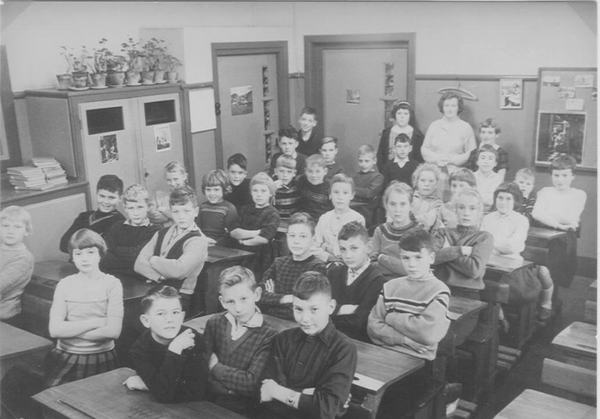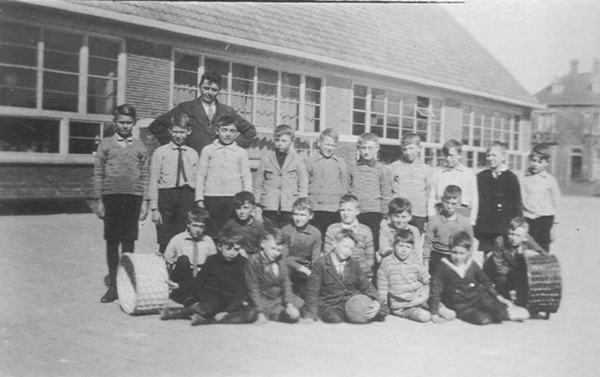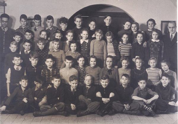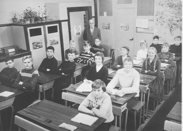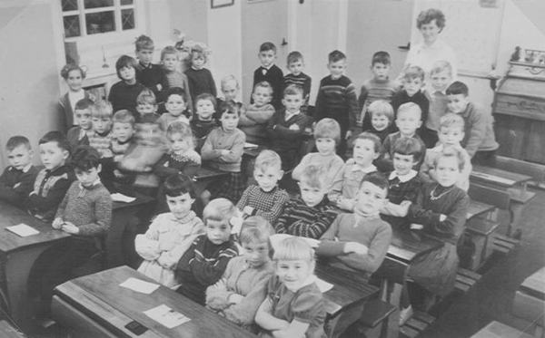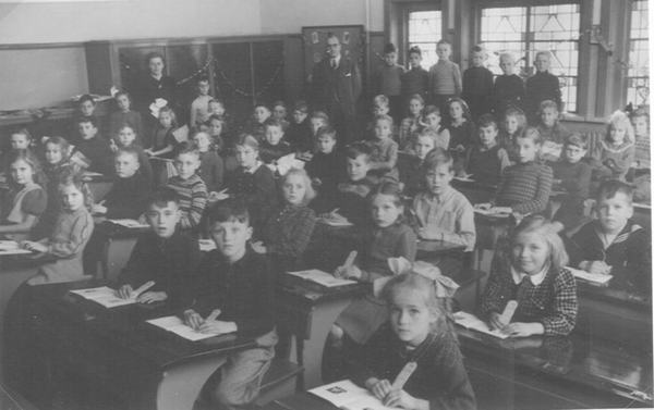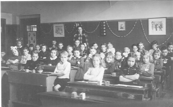 Julianaschool 1950. Het meisje rechts met haar handen gevouwen op haar tafel is Leuntje de Heer.