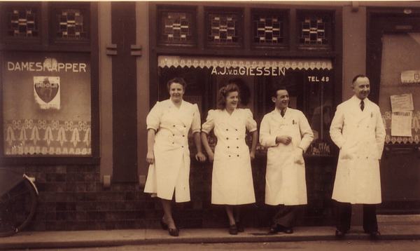 Kapper Van der Giessen en personeel voor de kapperswinkel in de Kerkbuurt op de foto