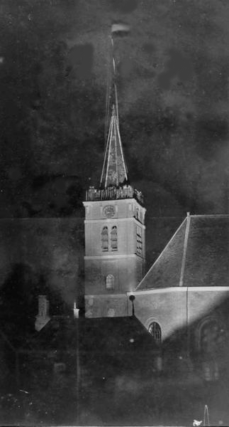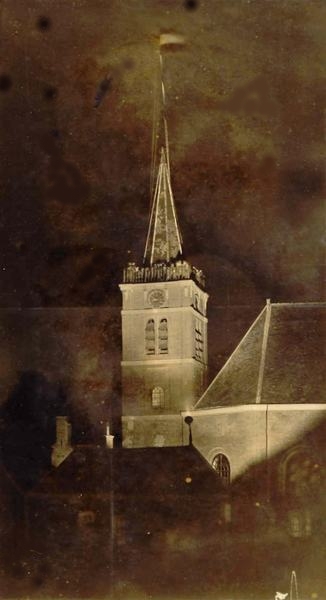 Een verlichte kerktoren van de Nederlands Hervormde Kerk