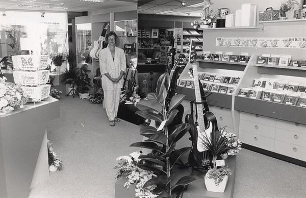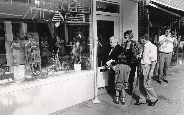 Hommersons muziekwinkel. Hier draagt mevrouw Hommerson de winkel over aan dochter en schoonzoon, Piet Kraaijeveld.