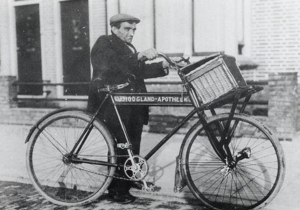 Medicijnenrondbrenger van apotheek Hoogland met transportfiets. Dit is Piet Bot, in ieder geval de bezorger van mijn vader Pieter Hoogland. Misschien is hij ook nog wel de bezorger geweest van mijn grootvader Jan Hoogland.