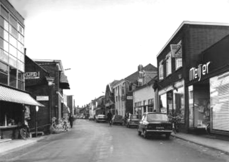 Kerkbuurt met de winkels van Meijwaard, Muilwijk, Kees van den Herik en fietsenhandel Dubbeldam