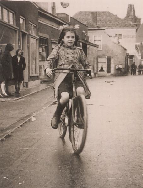 Op de fiets in de Kerkbuurt ter hoogte van de zaak van Meijwaard, verder te zien boekwinkel Van Wijngaarden, Broere en café Schalk