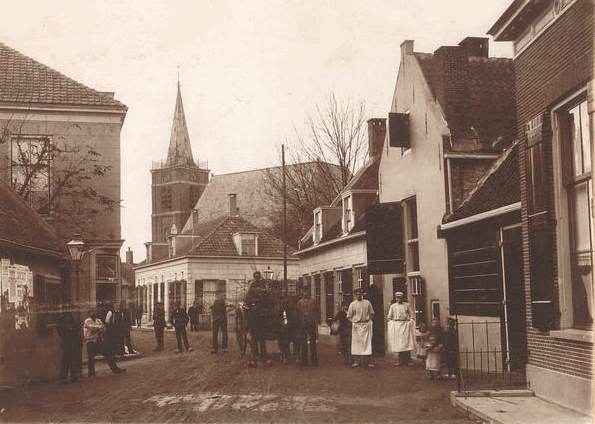 Kerkbuurt bij boekwinkel Van Wijngaarden, apotheek Hoogland, broeren en café Schalk