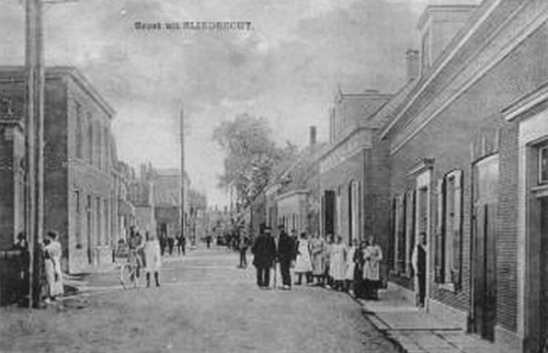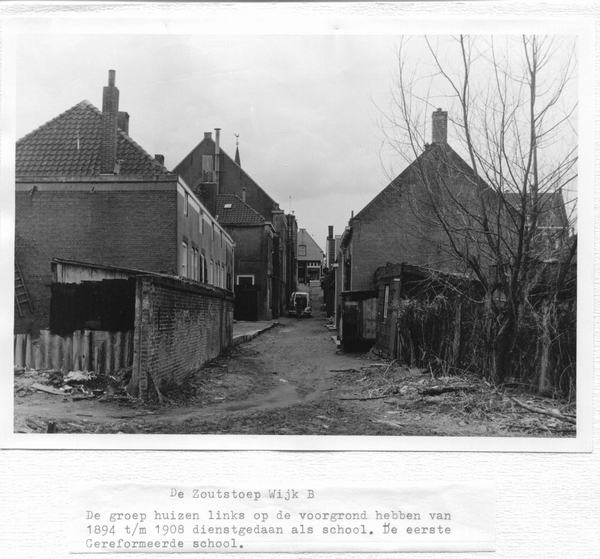 De vroegere Zoutstoep met op de achtergroend koekjesfabriek de Merba. Op de voorgrond was in eerdere tijden de eerste Gereformeerde school.