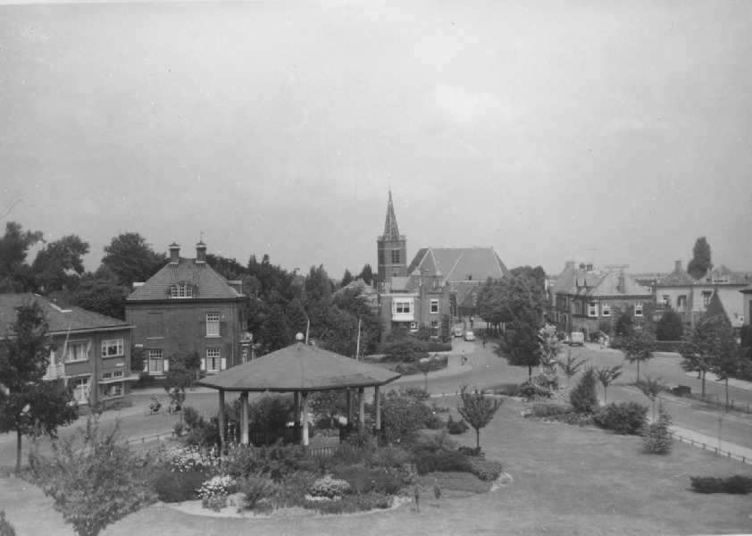 Dr. Langeveldplein met muziektent, gezien vanaf het gemeentehuis