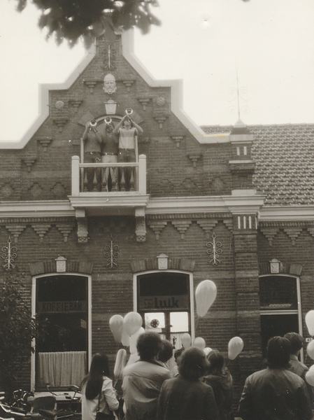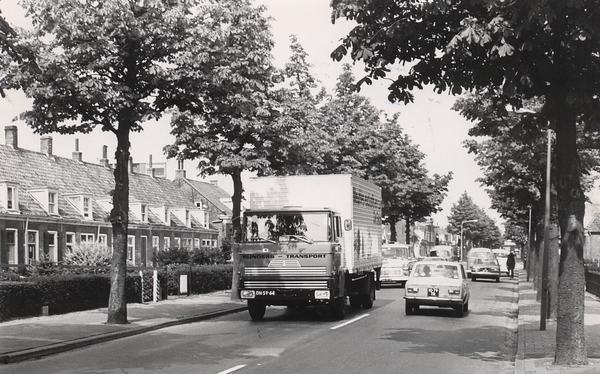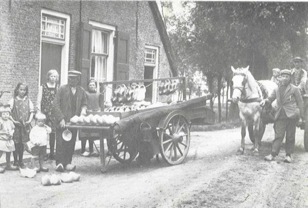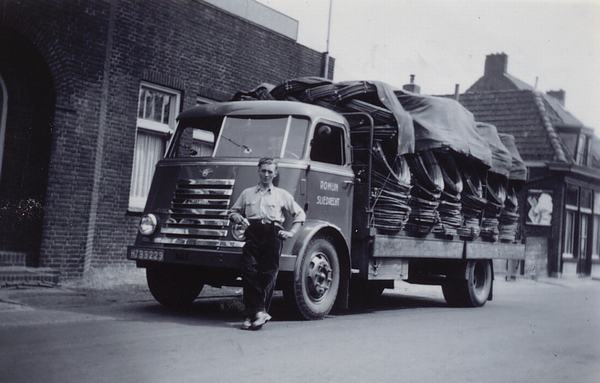 Kolenboer Romijn met hoepels op de vrachtauto ter hoogte van de vroegere Nutsspaarbank in Wijk C