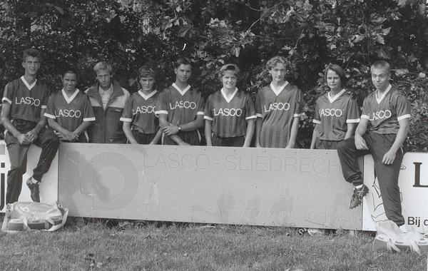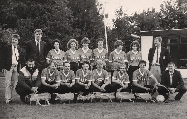 L en r sponsors. Staand voorz.Alfons ter Laak;Nel Broekzitter;Nel ter Laak;Annemiek v Eijl;Willemiek v Genderen;Jolande v/d Sman;Bernadette de Joode, Zittend;trainer Jan Versteeg;Dik Bakker;Ronald Borsje;Mark v/d Wiel;nb;Arjan v Eijl;Bram Visser