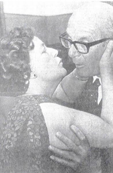 Burgemeester Van Hofwegen feliciteert actrice Lien van Arkel met haar toneeloptreden met Internos.