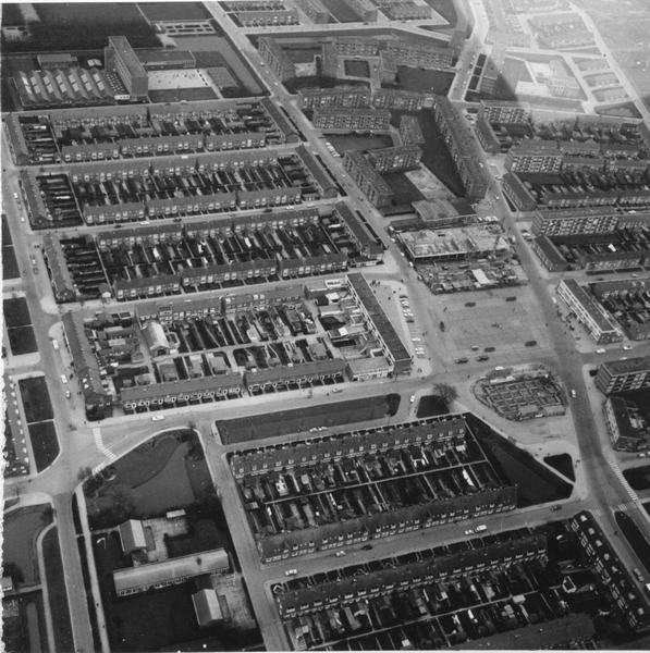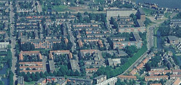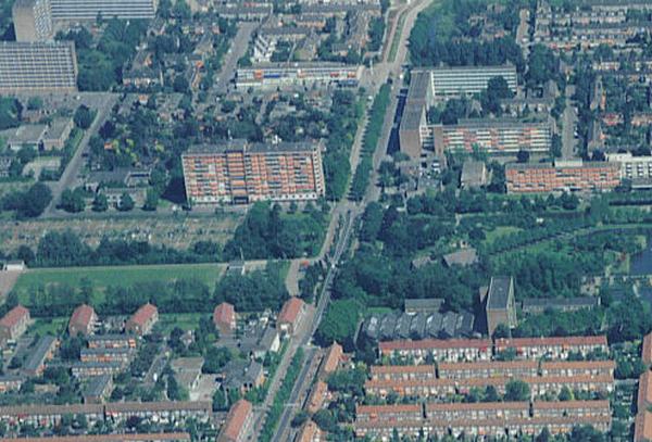 Luchtfoto omgeving IJsbaan ooostwijk bij Tienhoog flats