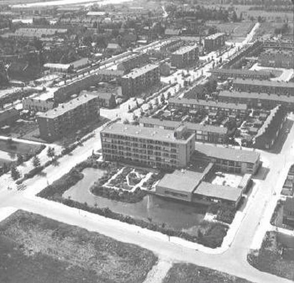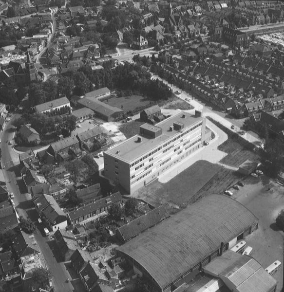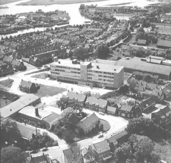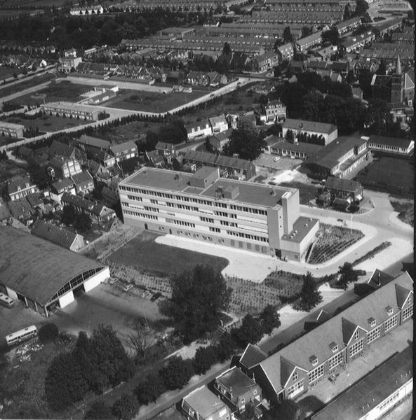 Centraal het oude en nieuwe ziekenhuis, de garagehal voor de autobussen van Ravesteijn, de T.P. en de voormalige MULO aan de Wilhelminastraat, eerder school 6.