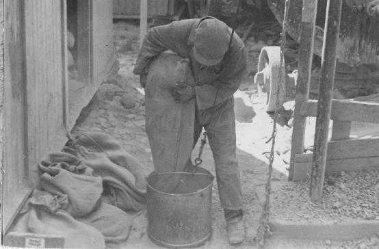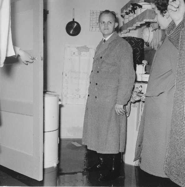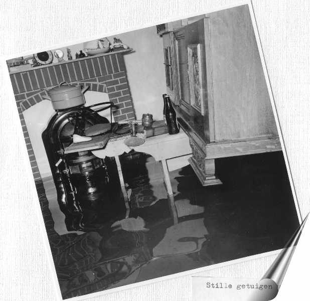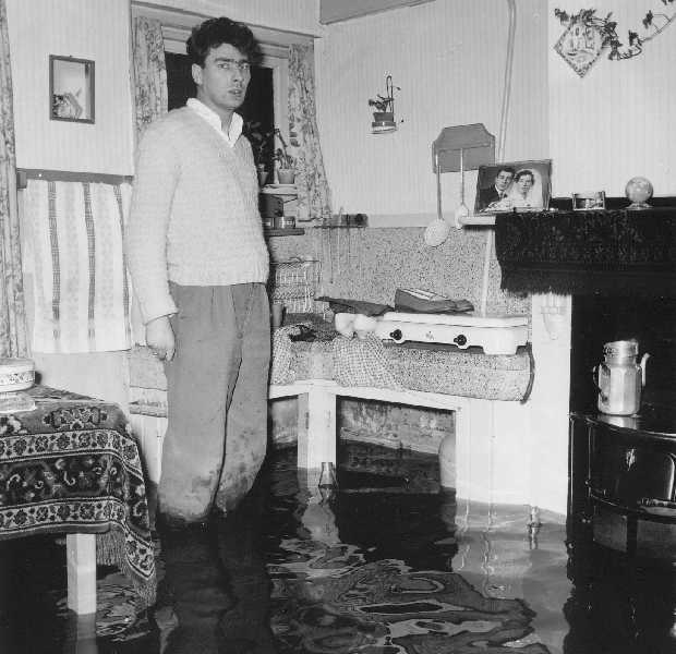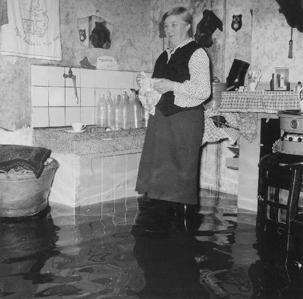 Buitendijks water in huis in 1959-1960 bij C 196. Water kwam via het Kleindiep en de daarbijhorende gantels de woningen binnen.