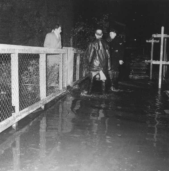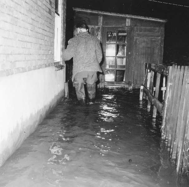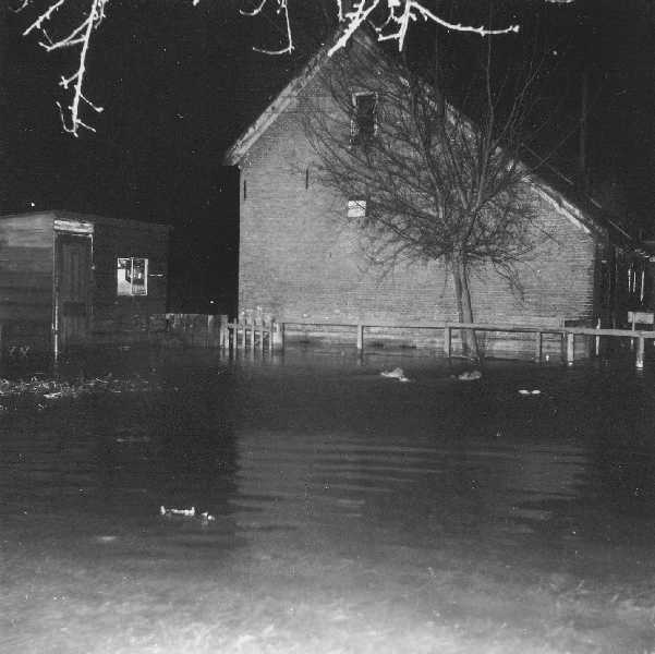 Buitendijks hoogwater in 1959-1960. Water kwam via het Kleindiep en de daarbijhorende gantels de woningen binnen.