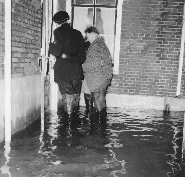 Watersnood 1953 in stoepBuitendijks hoogwater in 1959-1960. Water kwam via het Kleindiep en de daarbijhorende gantels de woningen binnen.