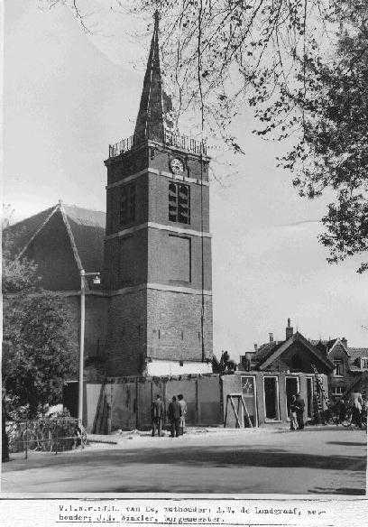 Nederlands Hervormde Kerk tijdens de sloop van enkele gebouwen, waaronder een voormalige school. Dit in verband met instortingsgevaar van de toren.
