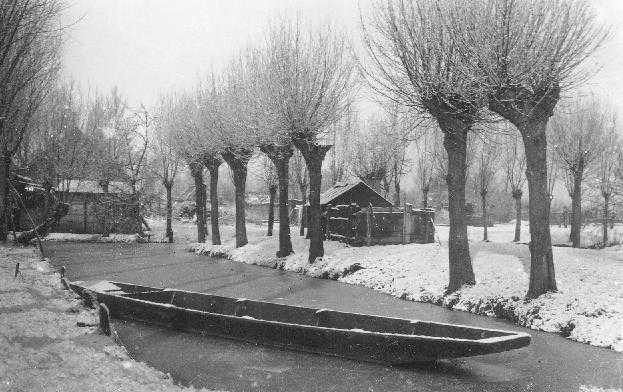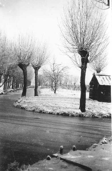 Winter in de weiland. In de dichtgevroren sloot een schouw.