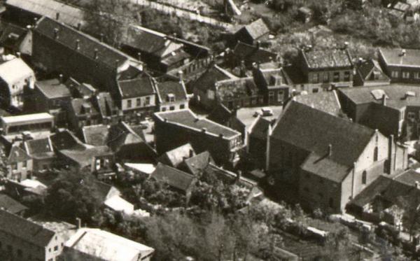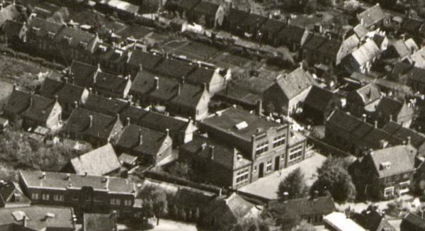 Luchtfoto van vroegere koekjesfabriek De Merba, voorheen Gereformeerde Kerk