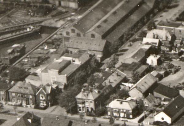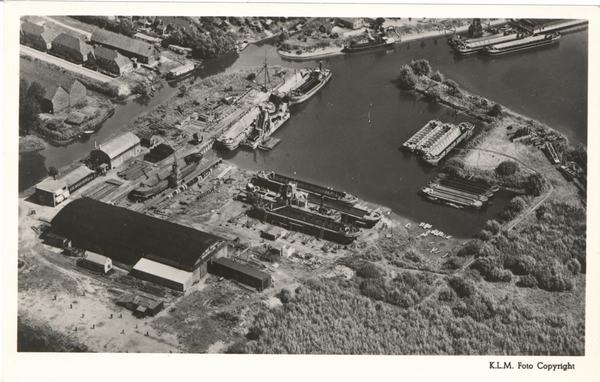 Luchtfoto omgeving Merwestraat nabij voormalige kleuterschool, nu De Rank. Ook te zien de Industrieweg met scheepswerf De Klop.