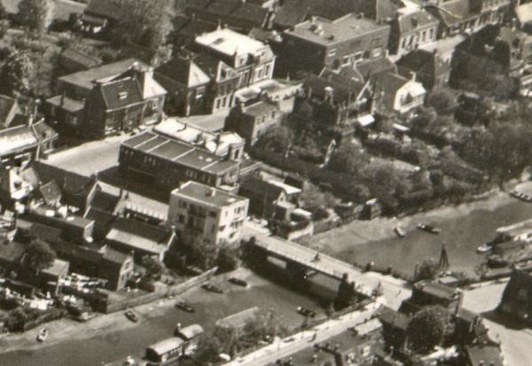 Luchtfoto met Kerkstraat, Wilhelminastraat en het nog niet gedempte Kleindiep