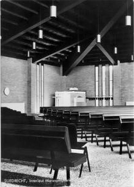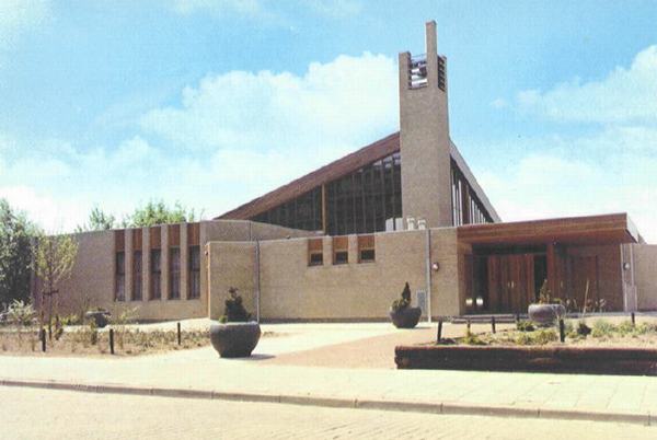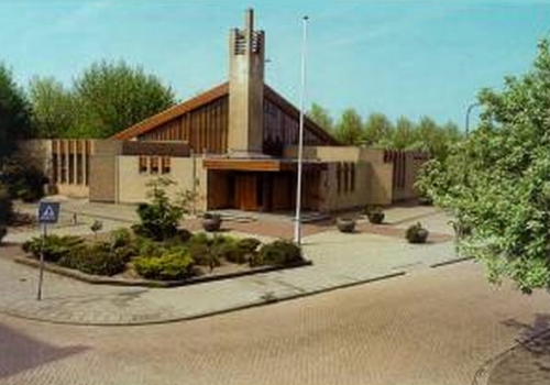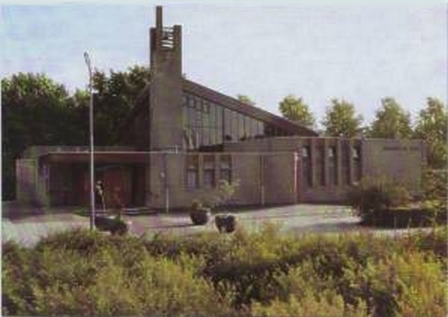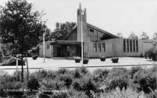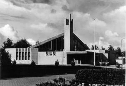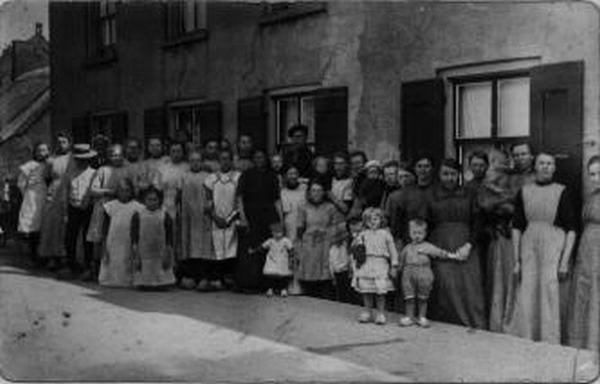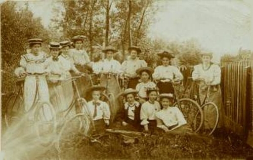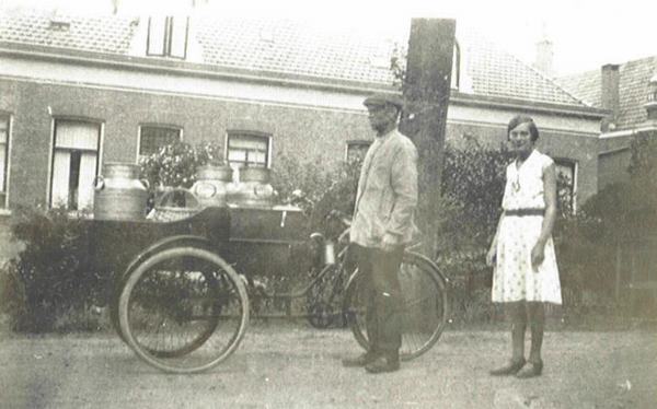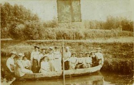 Groep mensen op de dijk voor het Maranathagebouw, recht tegenover de plaats waar nu de Thorbeckelaan de dijk 'opkomt'
