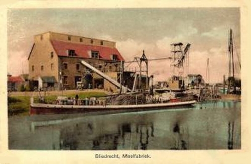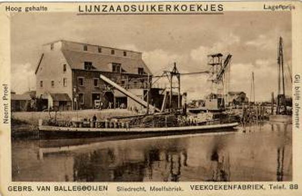 Meelfabiek Van Ballegooijen aan de haven. Meel- en veevoederfabriek Gebrs. Van Ballegooijen (Aalbert, Driekus, Gerrit}.Bouwheren van de fabriek.