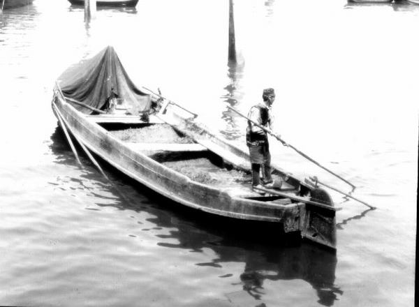 De man staat in een zogenaamde Sliedrechtse aak en is zand aan het beugelen.