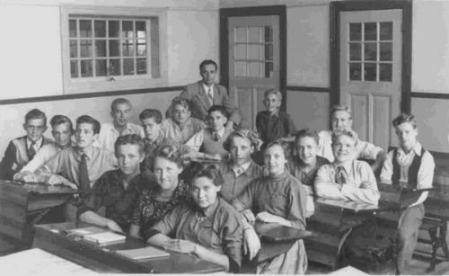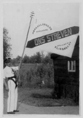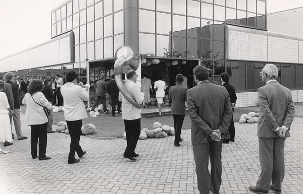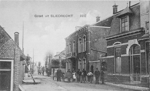 Groep mensen voor de voormalige pastorie van de Nederlands Hervormde Kerk