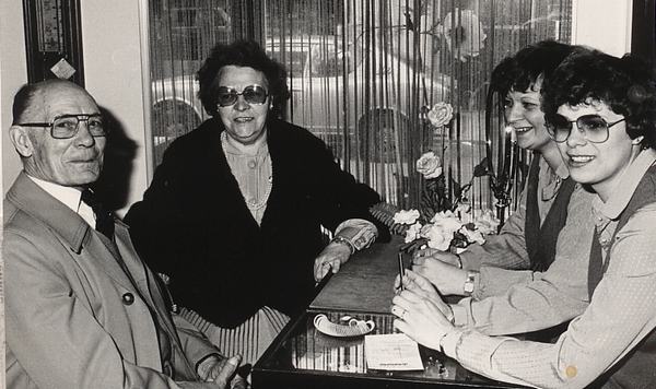 De zusjes Nederveen bij de heropening van de zaak van vader schilder Nederveen.