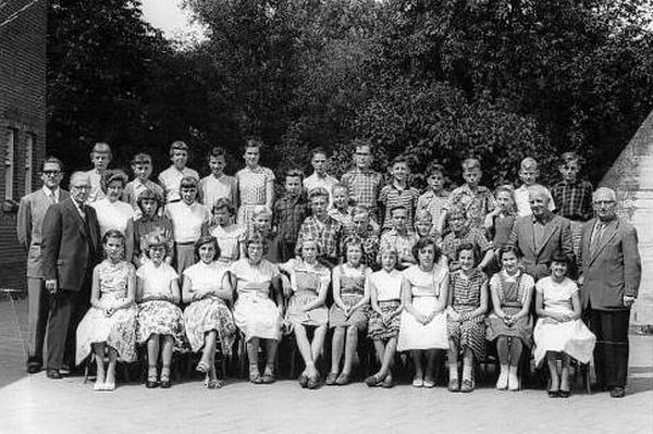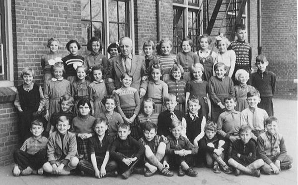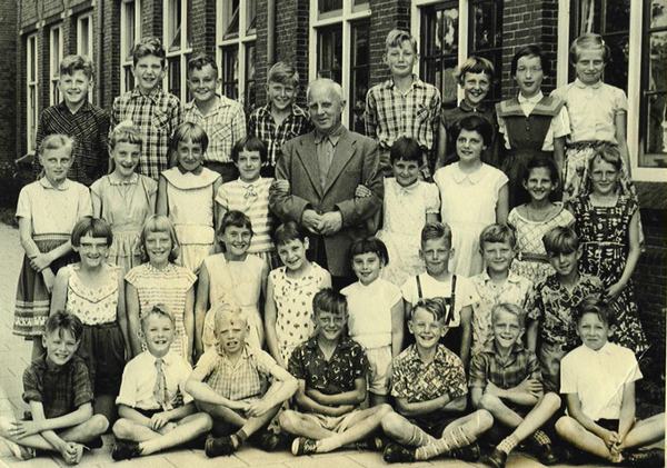 Schoolfoto van School IV, later Jan Ligthartschool met meester den Braven circa 1956/57.