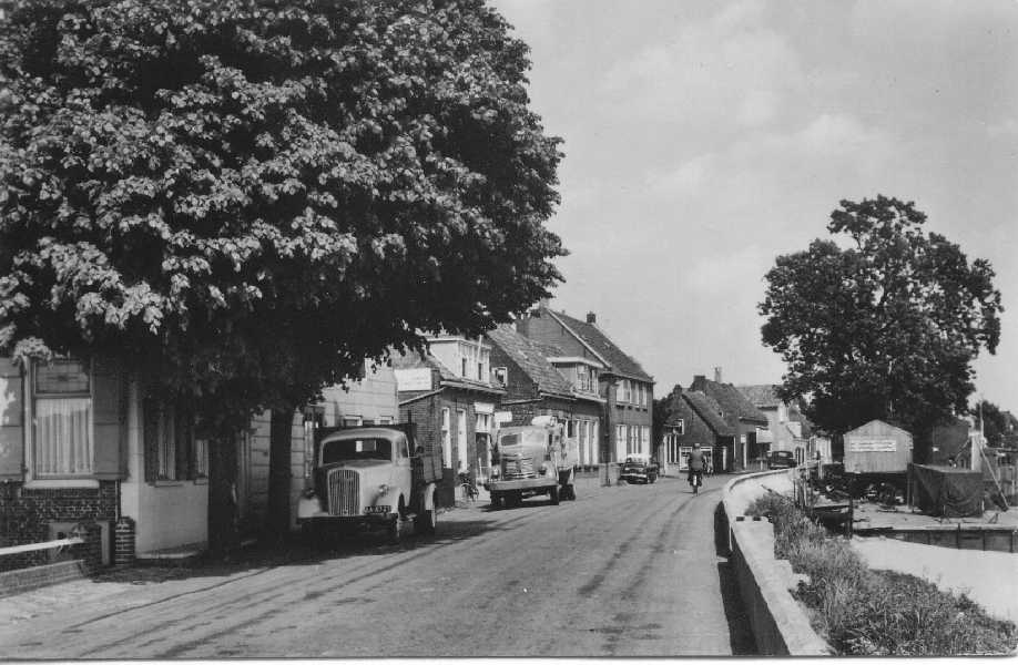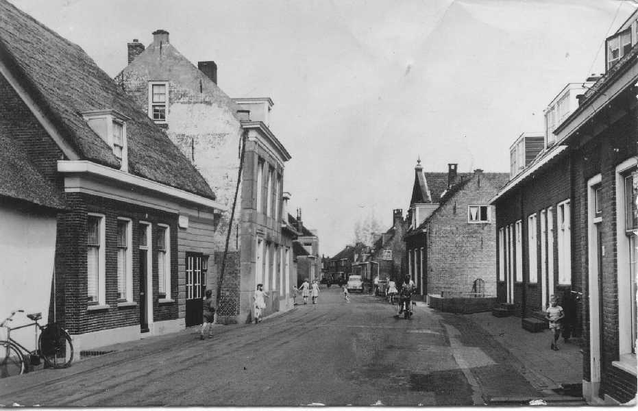 Baanhoek nabij vroegere herberg De Engel. Voor de timmerwinkel van timmerman Visser loopt Kees van Tilburg. Daarvoor rent Nellie Hofman. Aan de overzijde loopt Paul van Heukelom.