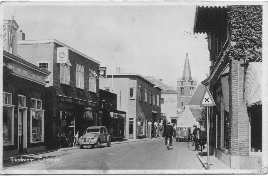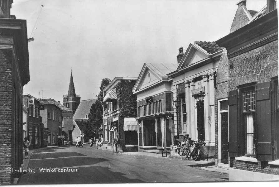 Kerkbuurt, links Meijwaard electro en Van Wijngaarden boekwinkel. Recht bloemenwinkel Vergeer.