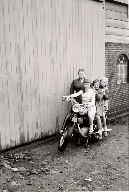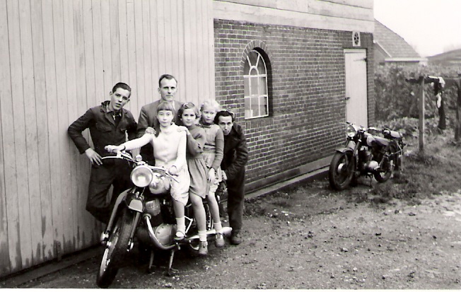 Op de motorfiets achter de woningen van slager Broeren en Harrewijn.