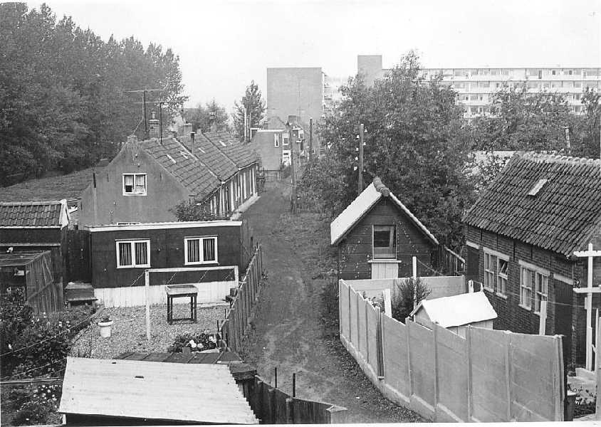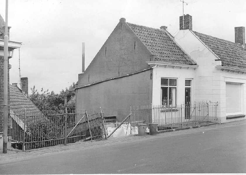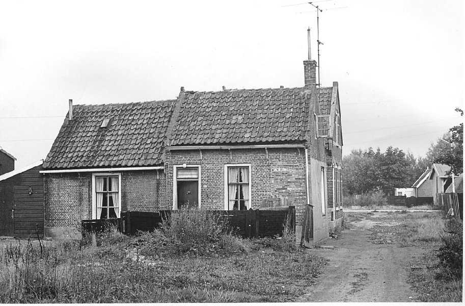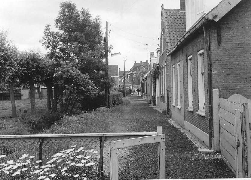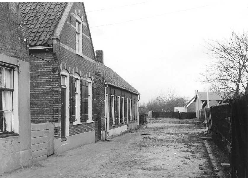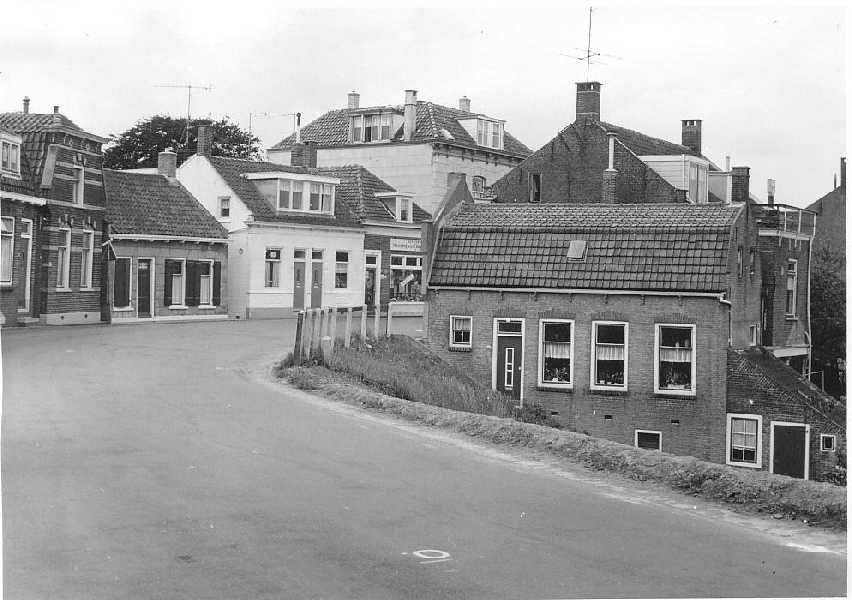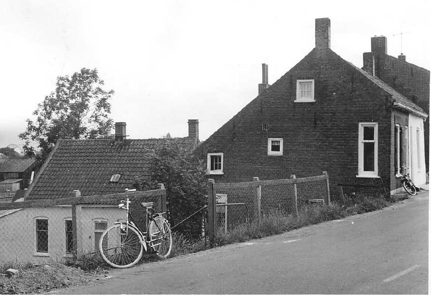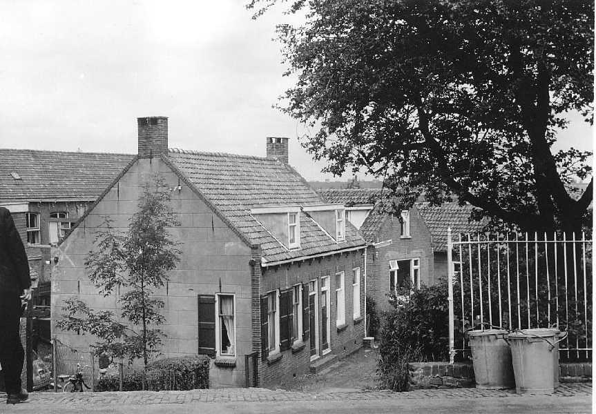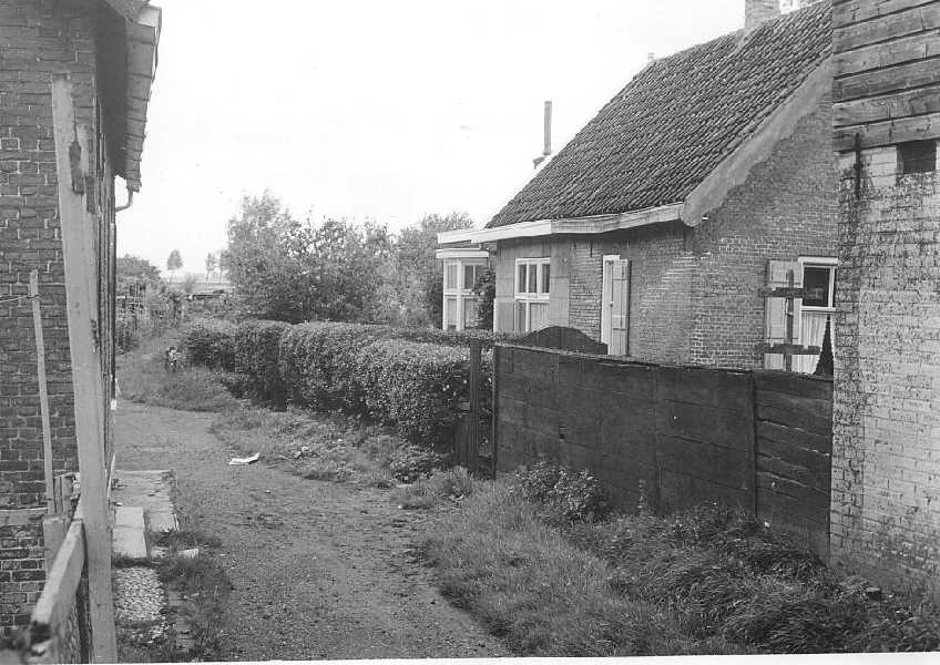 Omgeving bij De Wiel. Bij het paaltje kon je de stoep naar beneden, waar achterin Krijn de Leugenaar woonde. A 971. Het met aanbouw met fiets tegen het hekje werd bewoond door de familie Van der Plas tussen 1953 en 1966.
