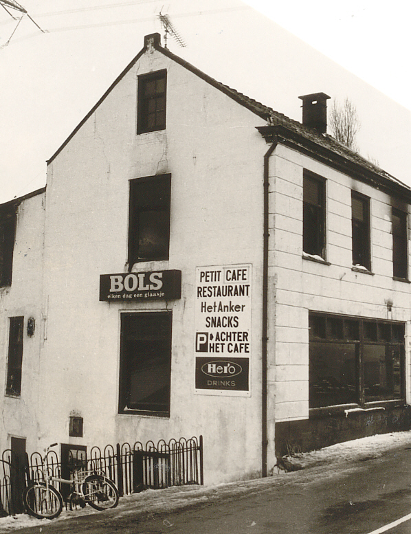 Groep mensen voor het cafe-dansschool van Fre van Meer tegenover scheepswerf Schlieker op de Kaai