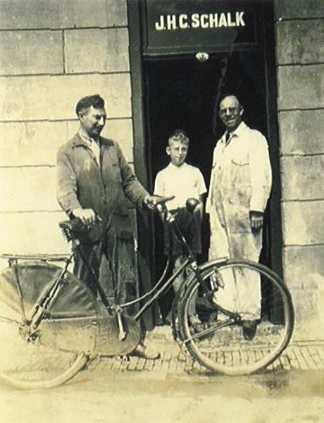 Fietsenzaak Schalk in de Kerkbuurt, nu is hier De Vries, verfwinkel gevestigd... Op de foto Schalk en Klaas van Eik