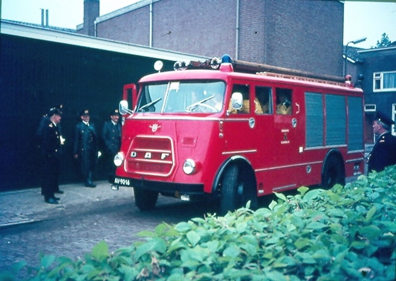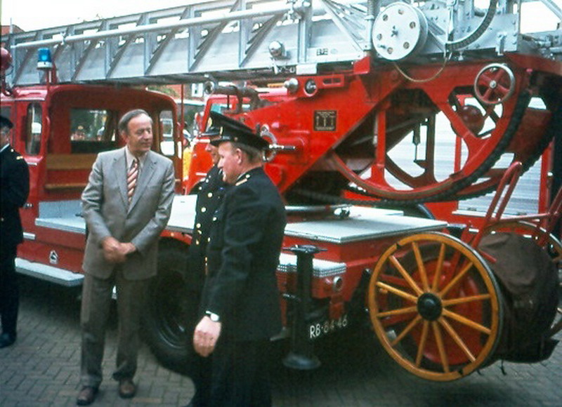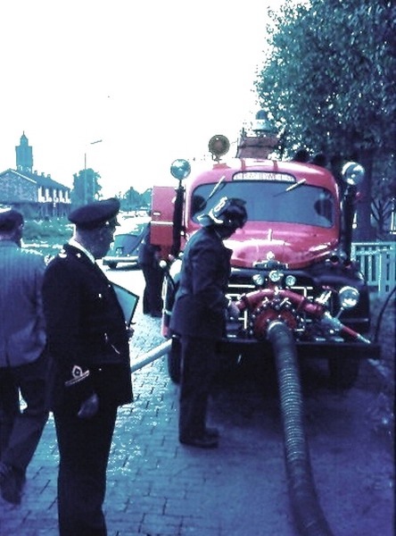 Brandweerauto. Kennismakingsbezoek van de nieuwe burgemeester W.Hendriks. Op de foto Gomp van Wijgerden.