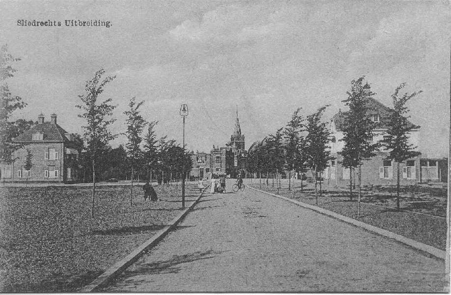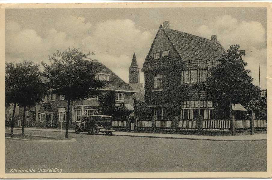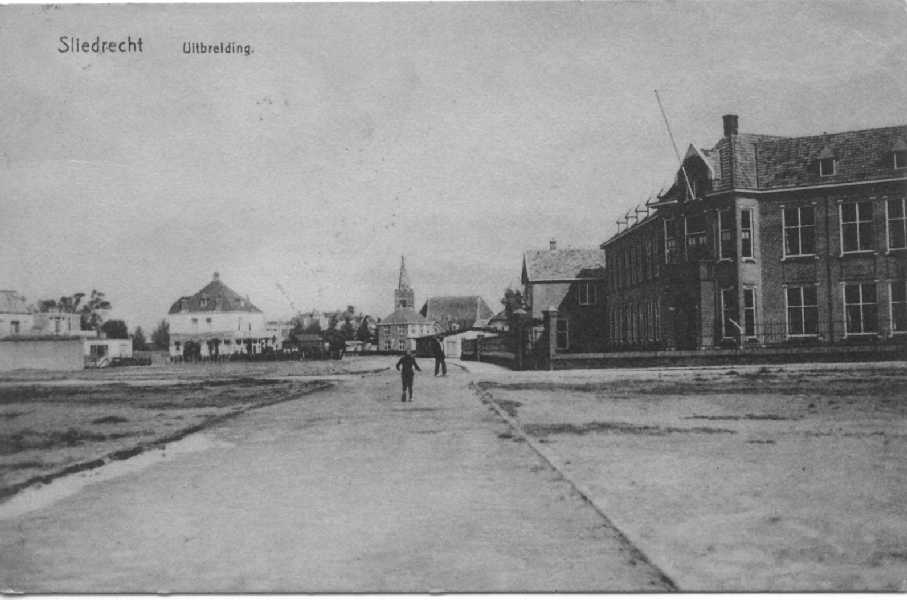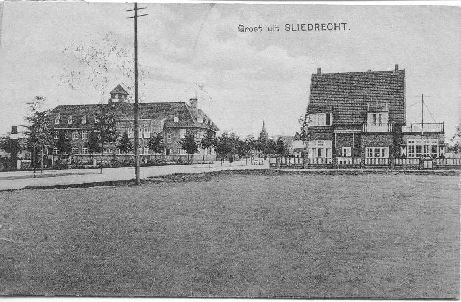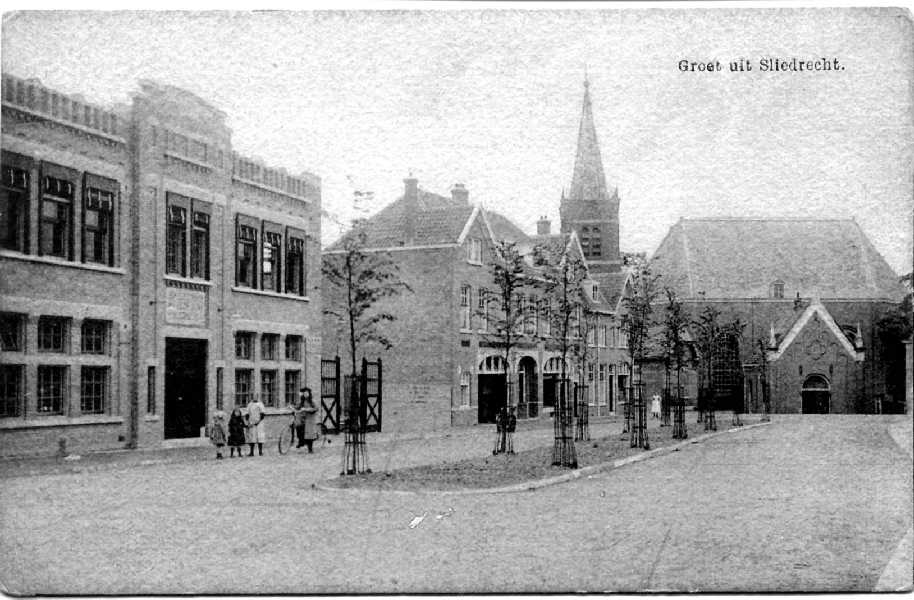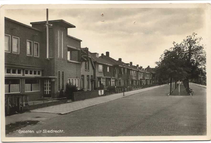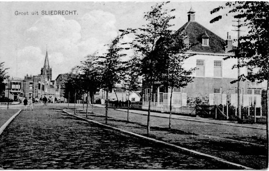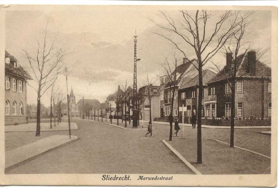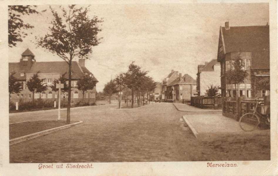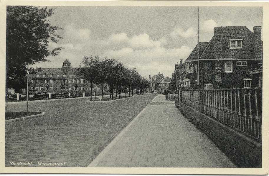 Merwestraat bij het Julianaschool, nu Oranje Nassauschool. Op achtergrong het Sliedrechtse gemeentehuis.