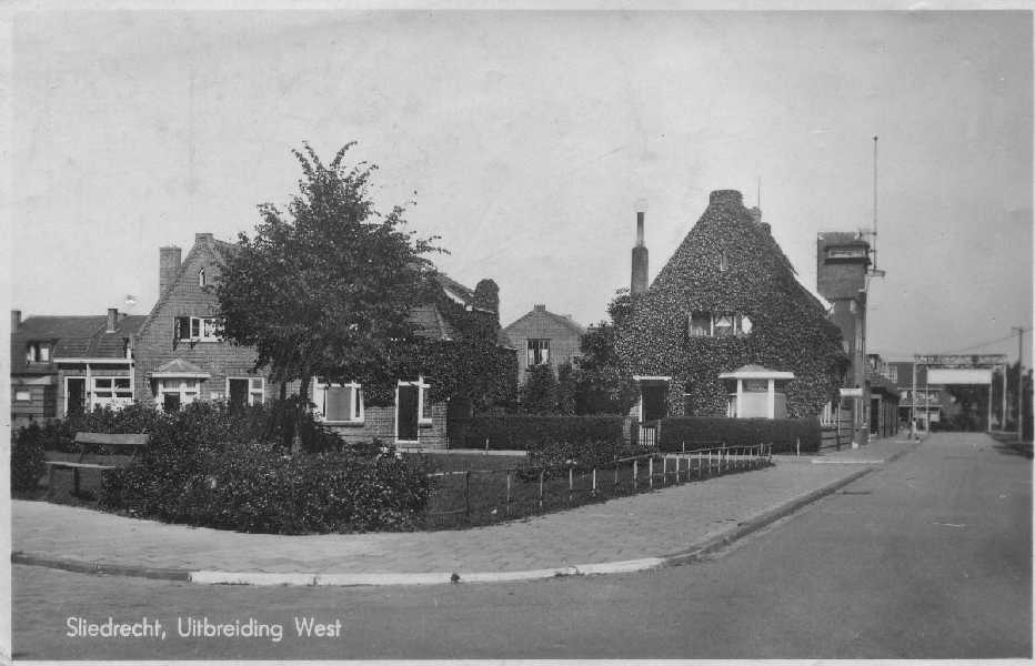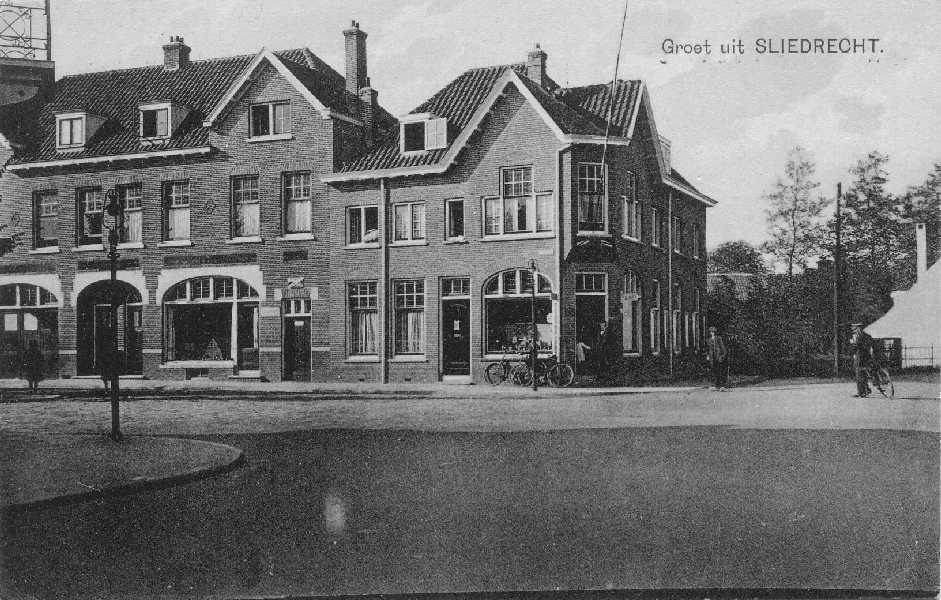 Hoek Kerkstraat en dijk, op de hoek slagerwinkel van Jan Bakker.