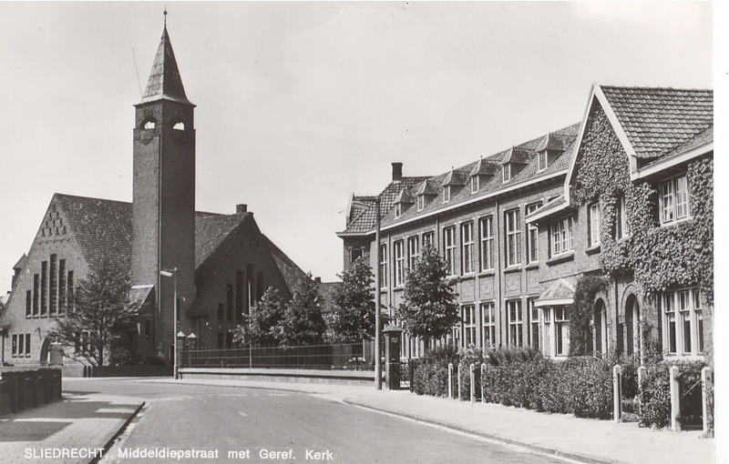 Gebouw van school 3 en ulo in de Middeldiepstraat, gezien vanaf de Gereformeerde Kerk.