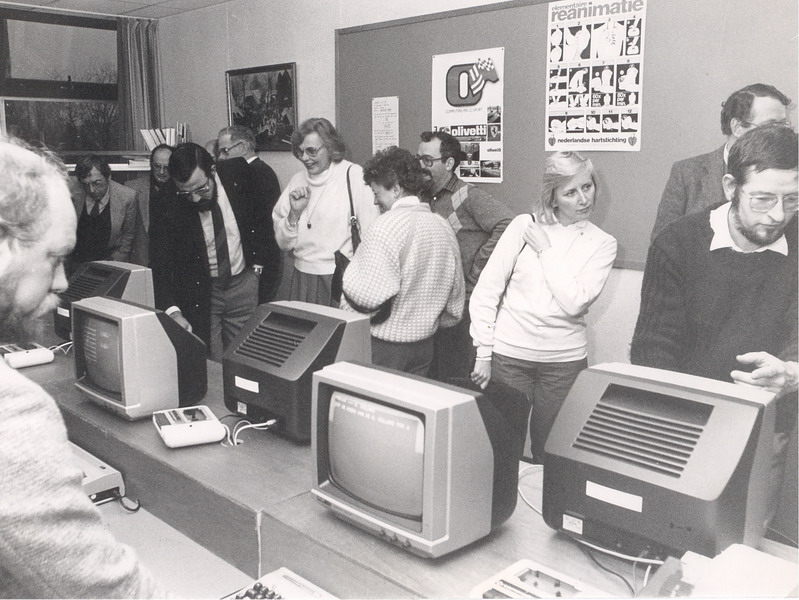 Computerbijeenkomst onderwijzend personeel Sliedrecht bij de Erasmusmavo. Demonstratie Commadores