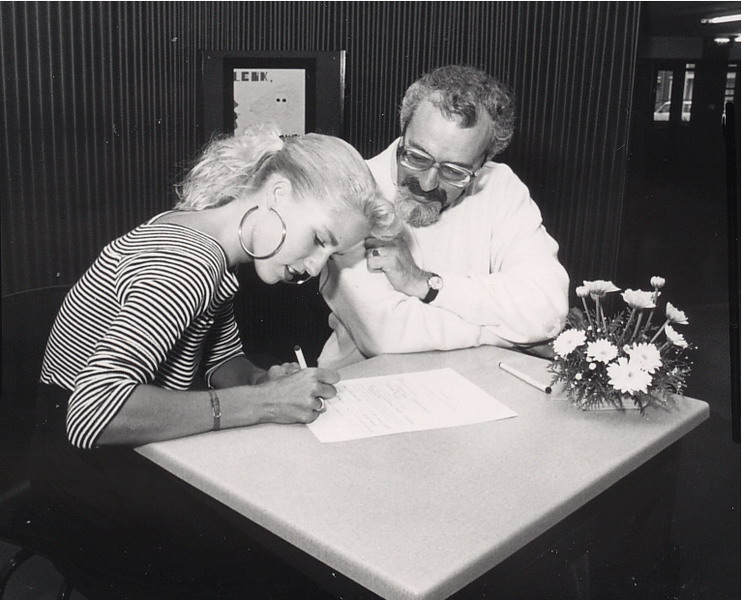 Geslaagde leerling, Chantal Groeneveld, van de Erasmusmavo tekent haar diploma onder het toeziend oog van leraar Nederlands en Duits, Kees Holleman.