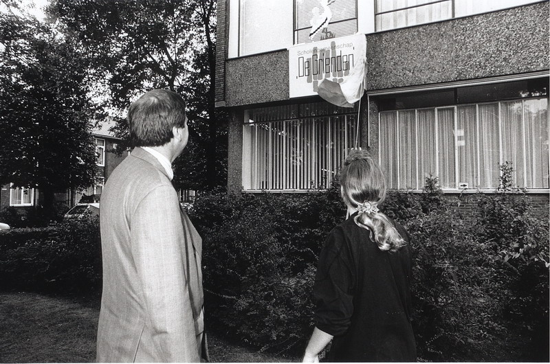 Presentatie vlag scholengemeenschap De Grienden door wethouder Gerrit Venis.